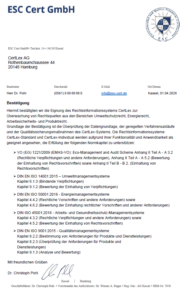 Seit 1998 unterstützen wir Unternehmen europaweit, ihre Compliance sicherzustellen. Zunächst unter dem Namen UIS (Umweltrechts-Informationsservice) bekannt, ist unsere Web-Anwendung seit 2014 unter dem Namen CertLex verfügbar. Seit 2017 firmieren wir als eigenständige CertLex AG mit Sitz in Hamburg.